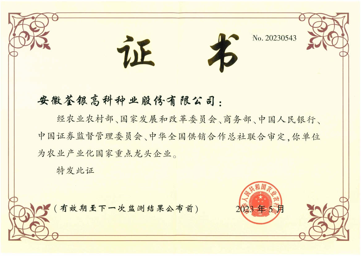 2012年9月被認(rèn)定為農(nóng)業(yè)部首批“育繁推一體化企業(yè)”; 2012年12月通過(guò)安徽省著名商標(biāo)復(fù)審 ; 2012年12月獲得“安徽省農(nóng)業(yè)產(chǎn)業(yè) 化省級(jí)龍頭企業(yè)”重新認(rèn)定 ; 2012年12月獲得“安徽省創(chuàng)新型企業(yè)”