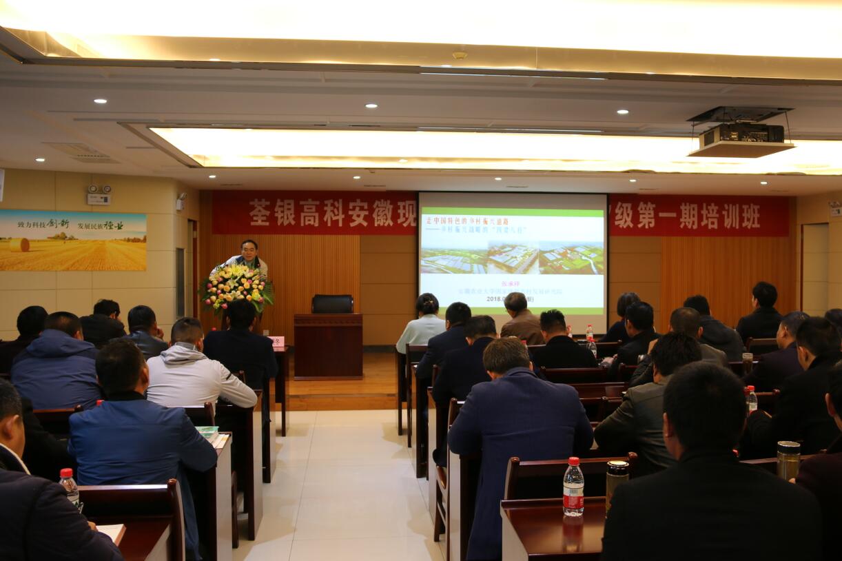 ? ? 本次培訓(xùn)班由安徽省農(nóng)委主辦、荃銀高科承辦,集中培訓(xùn)時(shí)間為3月18日至22日,主要培訓(xùn)課程有水稻規(guī)模生產(chǎn)管理技術(shù)、水稻育種及品種選用、社會(huì)化服務(wù)組織對(duì)接、小麥規(guī)模生產(chǎn)管理技術(shù)、新型職業(yè)農(nóng)民職業(yè)素養(yǎng)、現(xiàn)代農(nóng)業(yè)創(chuàng)業(yè)等。3月18日上午,安徽農(nóng)業(yè)大學(xué)新農(nóng)村發(fā)展研究院張承祥教授為學(xué)員開講“鄉(xiāng)村振興戰(zhàn)略”主題課。在學(xué)習(xí)培訓(xùn)期間,除了理論課程,農(nóng)場主學(xué)員們將于3月20日赴廬江郭河現(xiàn)代農(nóng)業(yè)科技示范園進(jìn)行參觀學(xué)習(xí),開展實(shí)踐教學(xué)活動(dòng)。